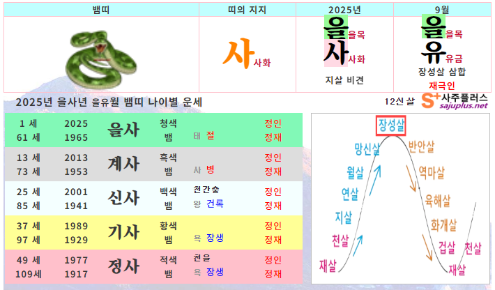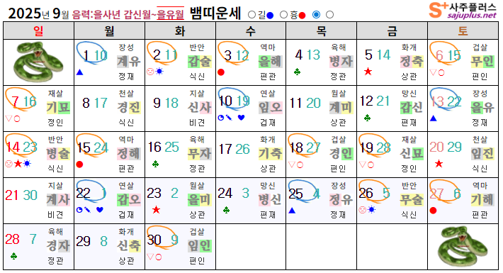 ▸뱀띠생 신살 (양력 9월 일진) ♣ 천을 : 4일, 12일, 16일, 24일, 28일 (힘든 순간 주변의 도움) ☀ 암록 : 2일, 14일, 26일 (뜻밖의 도움이나 재물운) ✎ 문창 : 10일, 22일 (학업운, 시험운 좋음) ❤ 도화 : 10일, 22일 (연애운, 이성에 인기) ○ 공망 : 6일, 7일, 18일, 19일, 30일 (노력에 비해 결실 부족) ★ 백호 : 5일, 14일, 20일, 23일 (교통사고, 부부불화 주의) |