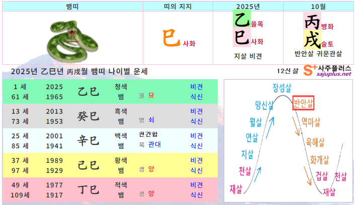 10월 뱀띠 운세 - 2025년 10월 을사년 병술월 띠별 연령별 사주 운세보기