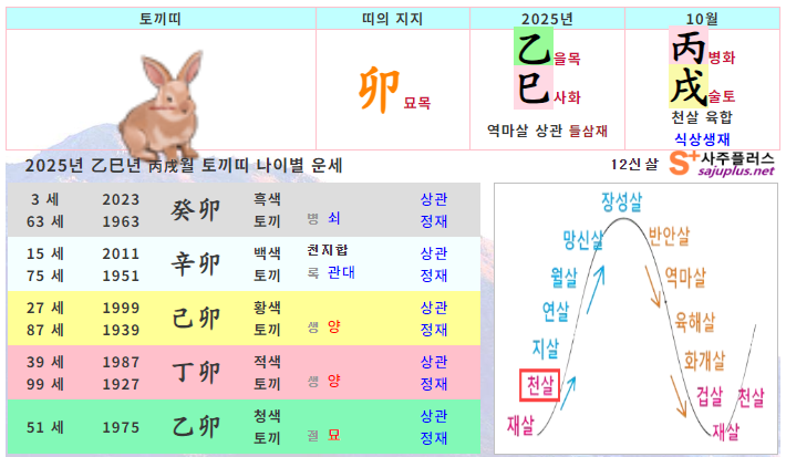 10월 토끼띠 운세 - 2025년 10월 을사년 병술월 띠별 연령별 사주 운세보기