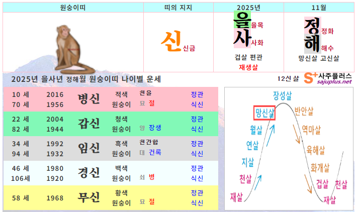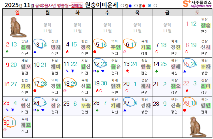 11월 원숭이띠 운세 - 2025년 11월 을사년 정해월 띠별 연령별 사주 운세보기