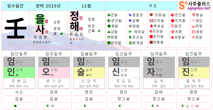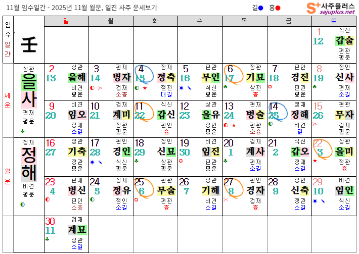 ❚ 임수일간 일진 운세 임수일간의 2025년 11월달 일진입니다. 중요한 날, 특히 주의해야 하는 날만 표시해 드리니, 하단의 합,충,형,원진 등의 도표와 첨부한 링크를 참조하셔서 확인하시기 바랍니다.