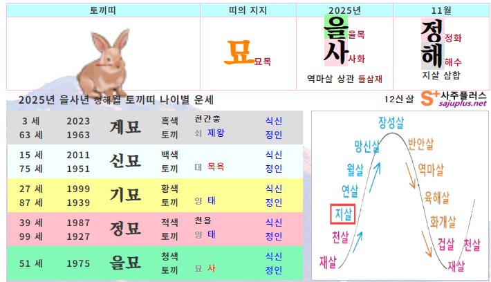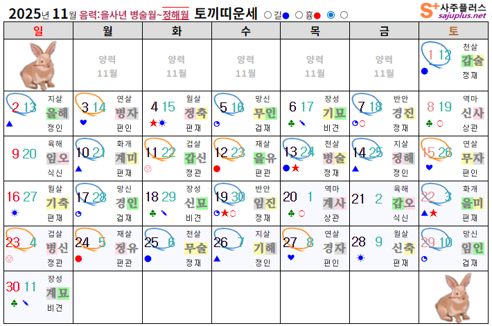 11월 토끼띠 운세 - 2025년 11월 을사년 정해월 띠별 연령별 사주 운세보기