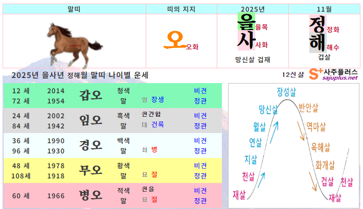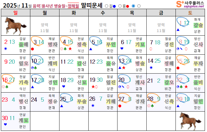 ▸말띠생 신살 (양력 11월 일진) ♣ 천을 : 4일, 10일, 16일, 22일, 28일 (힘든 순간 주변의 도움) ☀ 암록 : 2일, 14일, 26일 (뜻밖의 도움이나 재물운) ✎ 문창 : 8일, 20일 (학업운, 시험운 좋음) ❤ 도화 : 6일, 18일, 30일 (연애운, 이성에 인기) ○ 공망 : 7일, 8일, 19일, 20일 (노력에 비해 결실 부족) ★ 백호 : 4일, 13일, 19일, 22일 (교통사고, 부부불화 주의) |