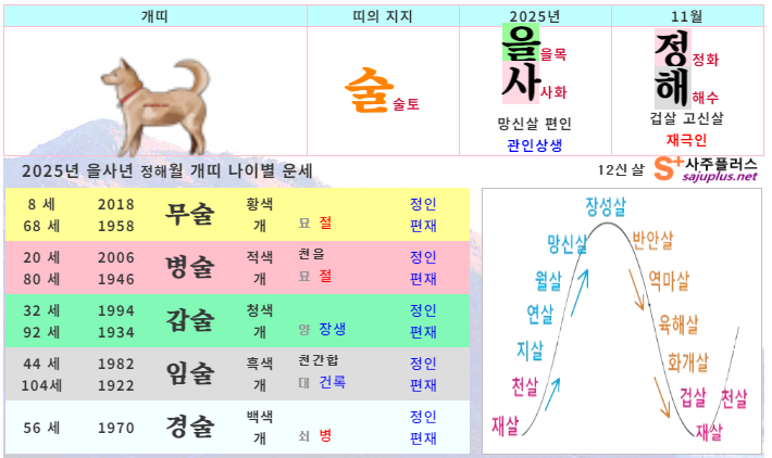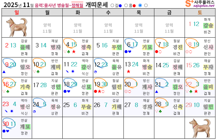 ▸개띠생 신살 (양력 11월 일진) ♣ 천을 : 4일, 10일, 16일, 22일, 28일 (힘든 순간 주변의 도움) ☀ 암록 : 11일, 23일 (뜻밖의 도움이나 재물운) ✎ 문창 : 11일, 23일 (학업운, 시험운 좋음) ❤ 도화 : 6일, 18일, 30일 (연애운, 이성에 인기) ○ 공망 : 7일, 8일, 19일, 20일 (노력에 비해 결실 부족) ★ 백호 : 4일, 13일, 19일, 22일 (교통사고, 부부불화 주의)