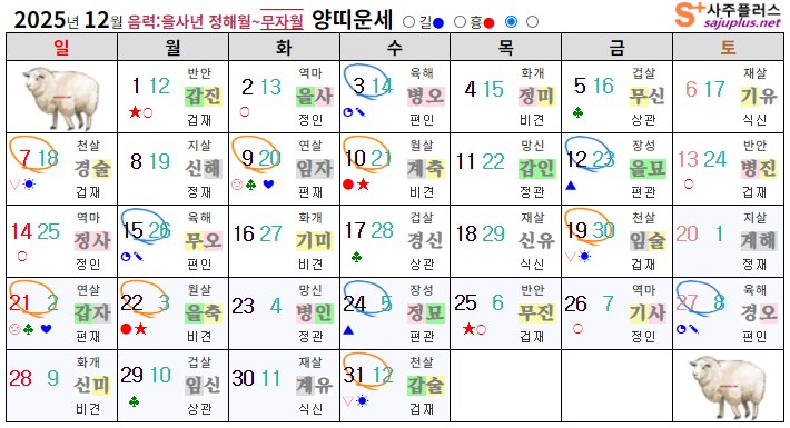 ▸양띠생 신살 (양력 12월 일진) ♣ 천을 : 5일, 9일, 17일, 21일, 29일 (힘든 순간 주변의 도움) ☀ 암록 : 7일, 19일, 31일 (뜻밖의 도움이나 재물운) ✎ 문창 : 3일, 15일, 27일 (학업운, 시험운 좋음) ❤ 도화 : 9일, 21일 (연애운, 이성에 인기) ○ 공망 : 1일, 2일, 13일, 14일, 25일, 26일 (노력에 비해 결실 부족) ★ 백호 : 1일, 10일, 22일, 25일 (교통사고, 부부불화 주의)