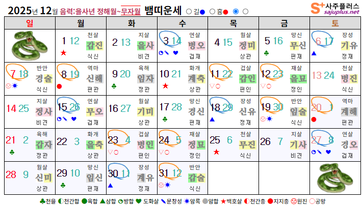 ▸뱀띠생 신살 (양력 12월 일진) ♣ 천을 : 5일, 9일, 17일, 21일, 29일 (힘든 순간 주변의 도움) ☀ 암록 : 7일, 19일, 31일 (뜻밖의 도움이나 재물운) ✎ 문창 : 3일, 15일, 27일 (학업운, 시험운 좋음) ❤ 도화 : 3일, 15일, 27일 (연애운, 이성에 인기) ○ 공망 : 11일, 12일, 23일, 24일 (노력에 비해 결실 부족) ★ 백호 : 1일, 10일, 25일 (교통사고, 부부불화 주의)