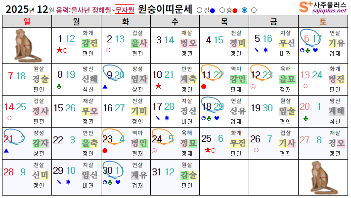 ▸원숭이띠생 신살 (양력 12월 일진) ♣ 천을 : 6일, 8일, 18일, 20일, 30일 (힘든 순간 주변의 도움) ☀ 암록 : 5일, 17일, 29일 (뜻밖의 도움이나 재물운) ✎ 문창 : 5일, 17일, 29일 (학업운, 시험운 좋음) ❤ 도화 : 6일, 18일, 30일 (연애운, 이성에 인기) ○ 공망 : 1일, 2일, 13일, 14일, 25일, 26일 (노력에 비해 결실 부족) ★ 백호 : 1일, 10일, 25일 (교통사고, 부부불화 주의) |