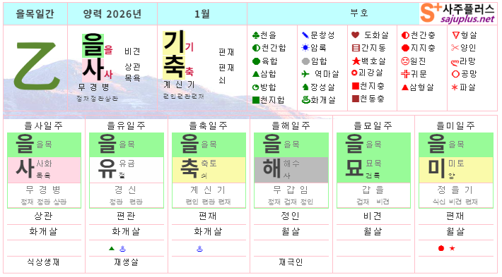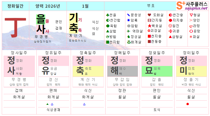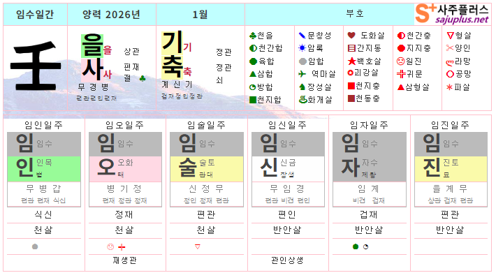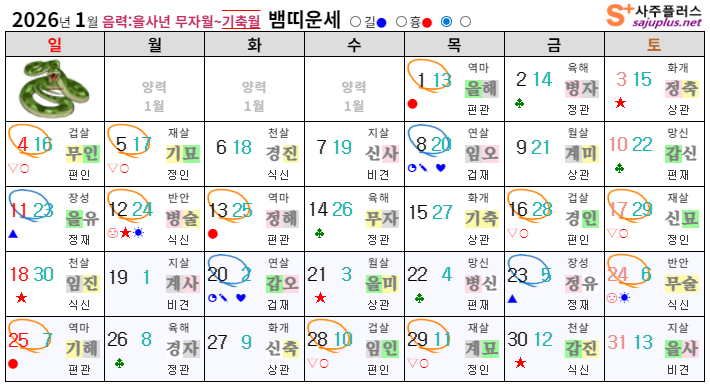 현실과 거리가 먼 이상에 매료되어, 독단과 독선으로 치달을 수 있으니, 주변사람들과 대인관계에서 균형을 잡는 것도 중요합니다. 지나친 자존심과 고집을 경계하며, 남과 어울리고 협력하는 태도를 기르는 것이 중요합니다. 화개살의 기운을 잘 활용한다면, 독창적인 재능을 발휘하여 큰 성공을 이룰 수 있습니다. ❚ 뱀띠 1월 일진 운세