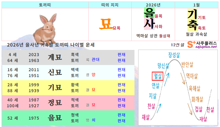▸뱀띠생 신살 (양력 1월 일진) ♣ 천을 : 2일, 10일, 14일, 22일, 26일 (힘든 순간 주변의 도움) ☀ 암록 : 12일, 24일 (뜻밖의 도움이나 재물운) ✎ 문창 : 8일, 20일 (학업운, 시험운 좋음) ❤ 도화 : 8일, 20일 (연애운, 이성에 인기) ○ 공망 : 4일, 5일, 16일, 17일, 28일, 29일 (노력에 비해 결실 부족) ★ 백호 : 3일, 12일, 18일, 21일, 30일 (교통사고, 부부불화 주의)
