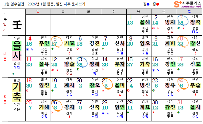 ❚ 임수일간 일진 운세 임수일간의 2026년 1월달 일진입니다. 중요한 날, 특히 주의해야 하는 날만 표시해 드리니, 하단의 합,충,형,원진 등의 도표와 첨부한 링크를 참조하셔서 확인하시기 바랍니다.