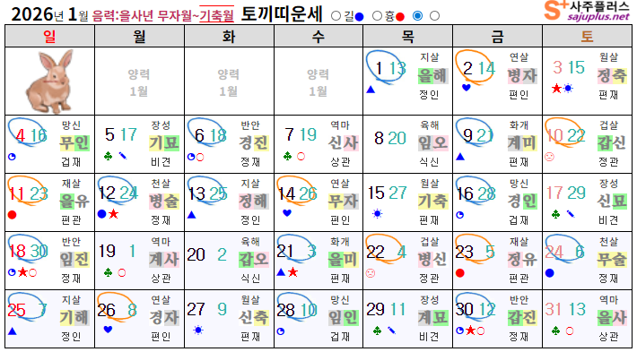 1월 토끼띠 운세 - 2026년 1월 을사년 기축월 띠별 연령별 사주 운세보기