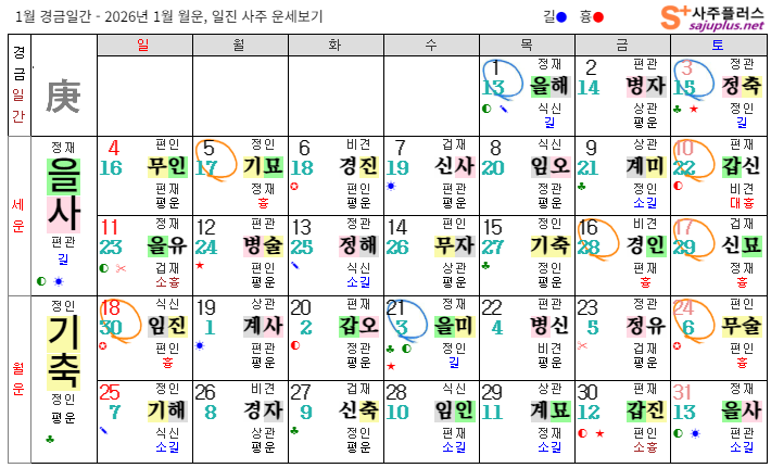 ❚ 경금일간 일진 운세 경금일간의 2026년 1월달 일진입니다. 중요한 날, 특히 주의해야 하는 날만 표시해 드리니, 하단의 합,충,형,원진 등의 도표와 첨부한 링크를 참조하셔서 확인하시기 바랍니다.