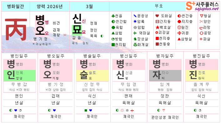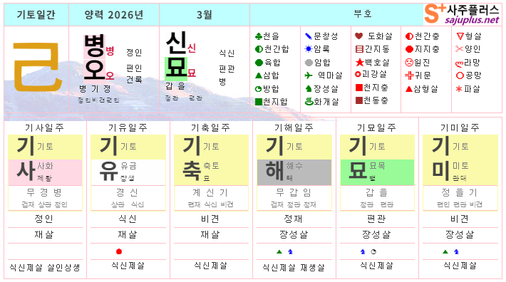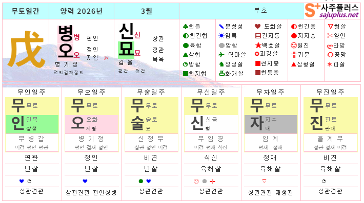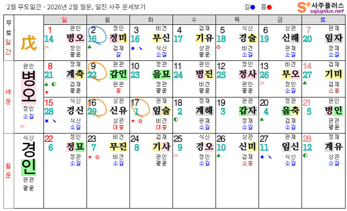 ❚ 무토일간 일진 운세 무토일간의 2026년 2월달 일진입니다. 중요한 날, 특히 주의해야 하는 날만 표시해 드리니, 하단의 합,충,형,원진 등의 도표와 첨부한 링크를 참조하셔서 확인하시기 바랍니다.