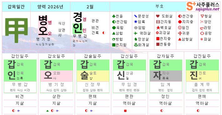 ❚ 무토일간 일진 운세 무토일간의 2026년 2월달 일진입니다. 중요한 날, 특히 주의해야 하는 날만 표시해 드리니, 하단의 합,충,형,원진 등의 도표와 첨부한 링크를 참조하셔서 확인하시기 바랍니다.