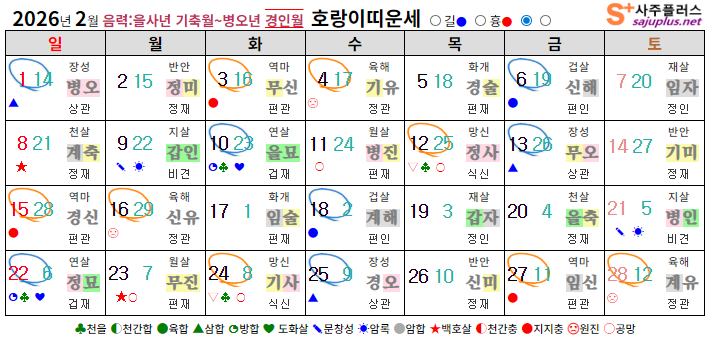 ▸호랑이띠생 신살 (양력 2월 일진) ♣ 천을 : 10일, 12일, 22일, 24일 (힘든 순간 주변의 도움) ☀ 암록 : 9일, 21일 (뜻밖의 도움이나 재물운) ✎ 문창 : 9일, 21일 (학업운, 시험운 좋음) ❤ 도화 : 10일, 22일 (연애운, 이성에 인기) ○ 공망 : 11일, 12일, 23일, 24일 (노력에 비해 결실 부족) ★ 백호 : 8일, 23일 (교통사고, 부부불화 주의) |