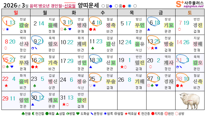 ▸양띠생 신살 (양력 3월 일진) ♣ 천을 : 3일, 11일, 15일, 23일, 27일 (힘든 순간 주변의 도움) ☀ 암록 : 1일, 13일, 25일 (뜻밖의 도움이나 재물운) ✎ 문창 : 9일, 21일 (학업운, 시험운 좋음) ❤ 도화 : 3일, 15일, 27일 (연애운, 이성에 인기) ○ 공망 : 7일, 8일, 19일, 20일, 31일 (노력에 비해 결실 부족) ★ 백호 : 4일, 13일, 16일, 19일, 22일, 28일, 31일 (교통사고, 부부불화 주의) |