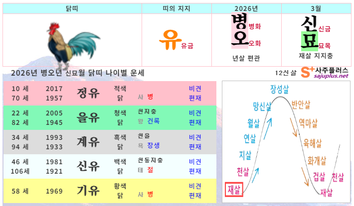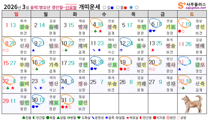 ▸개띠생 신살 (양력 3월 일진) ♣ 천을 : 4일, 10일, 16일, 22일, 28일 (힘든 순간 주변의 도움) ☀ 암록 : 11일, 23일 (뜻밖의 도움이나 재물운) ✎ 문창 : 11일, 23일 (학업운, 시험운 좋음) ❤ 도화 : 6일, 18일, 30일 (연애운, 이성에 인기) ○ 공망 : 7일, 8일, 19일, 20일, 31일 (노력에 비해 결실 부족) ★ 백호 : 4일, 13일, 19일, 22일, 31일 (교통사고, 부부불화 주의) |