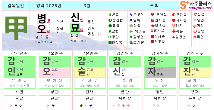 ❚ 육합 대인관계는 물론, 사업이나 추진하든 일에서 어려움이 풀려나가는 시기로 봅니다. 미혼자분들은 마음에 드는 이성을 만나는 행운이 따르고, 사업을 하시는 분들은 사업이 본궤도에 오르고 활력이 생기는 좋은 운입니다. 사소한 갈등은 풀려나가는 시기로, 부부간이나 연인간에도 더한 층 정감이 느껴지는 운새가 됩니다. 현실적인 문제에서도 대체로 순조롭고 잘 풀려나가는 시기라, 자신이 바라는 바를 대부분 이룰 수 있습니다. ❚ 상관견관 자신의 말이나 행동, 활동인 상관이 규율이나 규칙, 법에 해당하는 정관을 부정하는 것입니다.주변이 모두 잘못된 것으로 비춰져 자신이 바로잡아야 한다고 여길 수 있습니다. 천간에상관견관이 투출되면 밖으로 불만을 표출하는 것이 되고, 지지의 상관견관은 속으로 불평불만을 가진 것입니다.