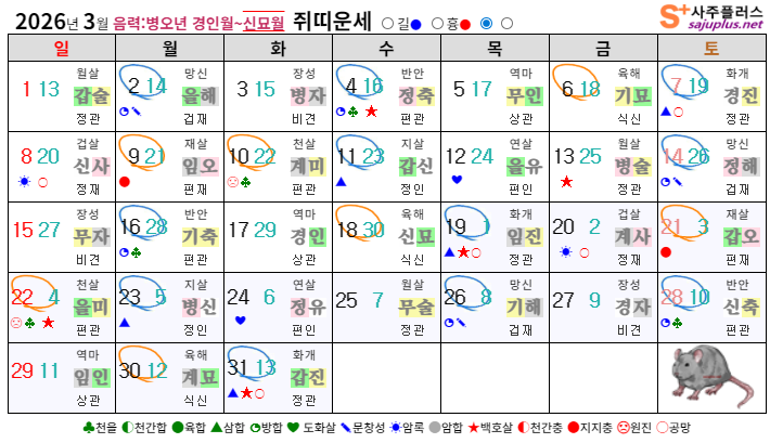 병화일간 3월운세-2026년 3월(신묘월) 일주운세 월운세, 일진운세 사주보기 운세보기