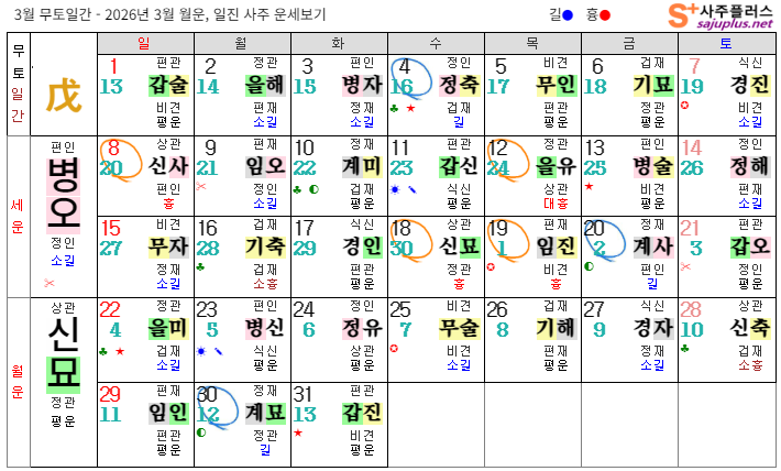 ❚ 무토일간 일진 운세 무토일간의 2026년 3월달 일진입니다. 중요한 날, 특히 주의해야 하는 날만 표시해 드리니, 하단의 합,충,형,원진 등의 도표와 첨부한 링크를 참조하셔서 확인하시기 바랍니다.