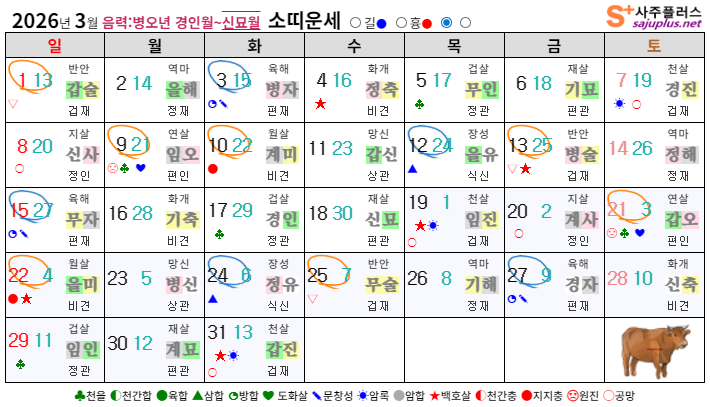 3월 소띠 운세 - 2026년 3월 병오년 신묘월 띠별 연령별 사주 운세보기
