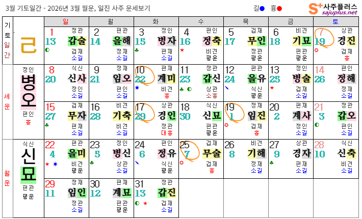 ❚ 기토일간 일진 운세 기토일간의 2026년 3월달 일진입니다. 중요한 날, 특히 주의해야 하는 날만 표시해 드리니, 하단의 합,충,형,원진 등의 도표와 첨부한 링크를 참조하셔서 확인하시기 바랍니다.