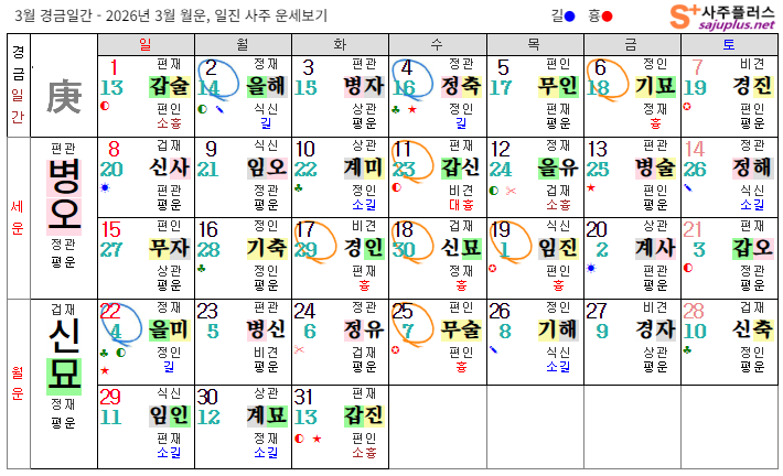 경금일간의 2026년 3월달 일진입니다. 중요한 날, 특히 주의해야 하는 날만 표시해 드리니, 하단의 합,충,형,원진 등의 도표와 첨부한 링크를 참조하셔서 확인하시기 바랍니다.
