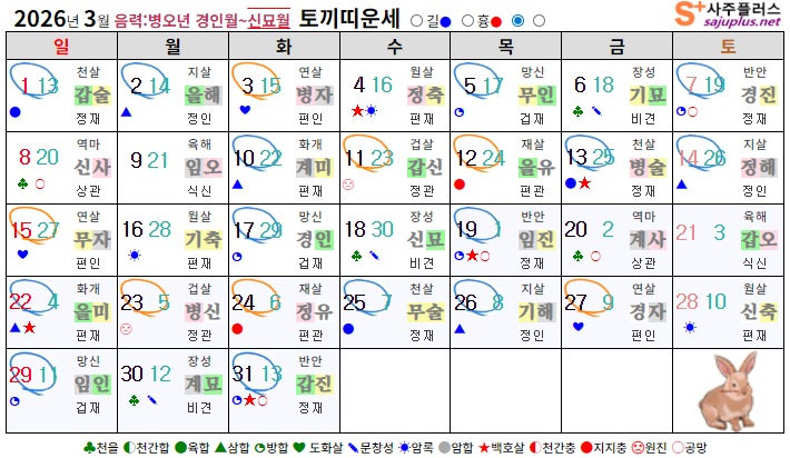 ▸토끼띠생 신살 (양력 3월 일진) ♣ 천을 : 6일, 8일, 18일, 20일, 30일 (힘든 순간 주변의 도움) ☀ 암록 : 4일, 16일, 28일 (뜻밖의 도움이나 재물운) ✎ 문창 : 6일, 18일, 30일 (학업운, 시험운 좋음) ❤ 도화 : 3일, 15일, 27일 (연애운, 이성에 인기) ○ 공망 : 7일, 8일, 19일, 20일, 31일 (노력에 비해 결실 부족) ★ 백호 : 4일, 13일, 19일, 22일, 31일 (교통사고, 부부불화 주의)
